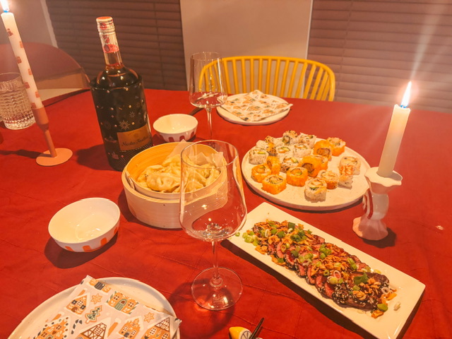 Dit jaar vierden Vin en ik al onze ‘kerstavond’ op de 23e. Die begon met bagels bij Bagels & Beans in de stad. Vervolgens deden we spelletjes met warme chocolademelk. ’s Avonds aten we sushi, beef tataki en gyoza (lijkt bijna een traditie te worden), en uiteraard met cadeautjes! ♥