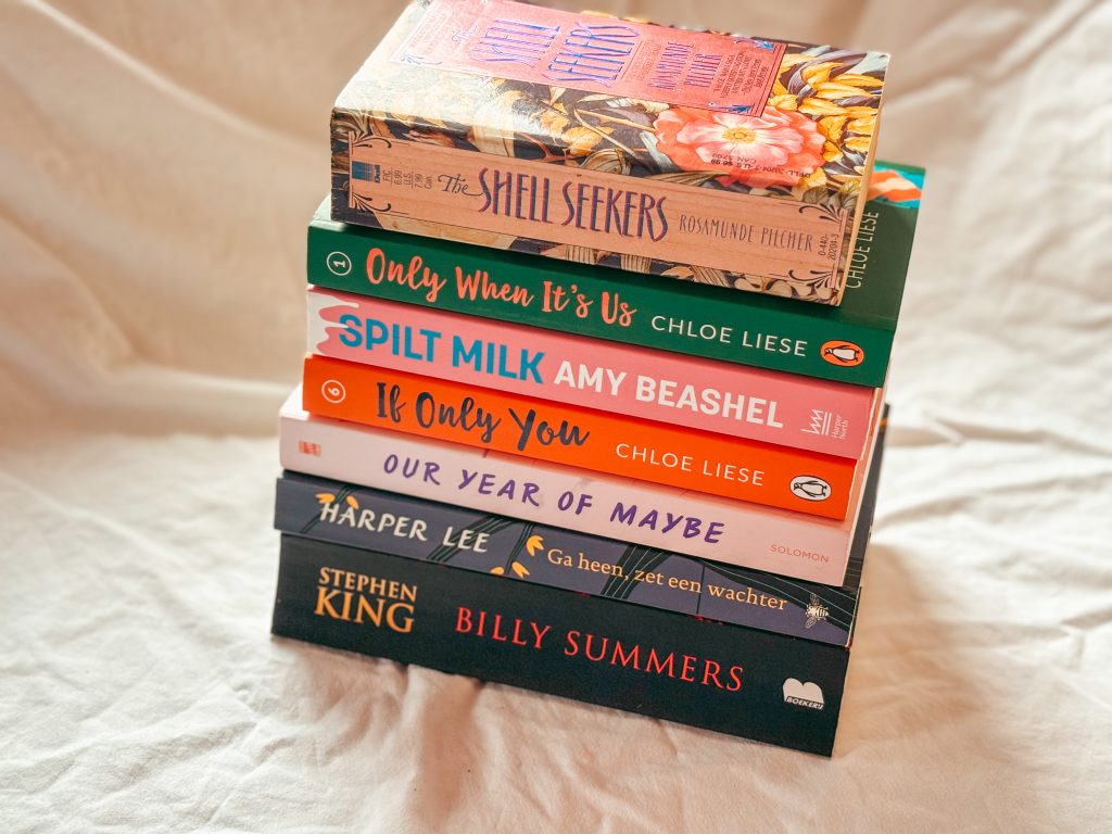 En dit is mijn Vinted-buit! Heeeeel tevreden mee! The Shell Seekers en Ga heen, zet een wachter lees ik dit jaar met Janneke. Billy Summers kocht ik vrij last minute, en hebben Vin en ik samen gelezen in Lapland (ZO LEUK, samen een boek lezen!!). Ik wil graag de Bergman-serie van Chloe Liese in de kast hebben staan, en deel 1 en 6 kon ik via Vinted komen. En tenslotte nog vrij random, Our Year of Maybe en Spilt Milk. Dat laatste boek is door de flaptekst op mijn radar verschenen.